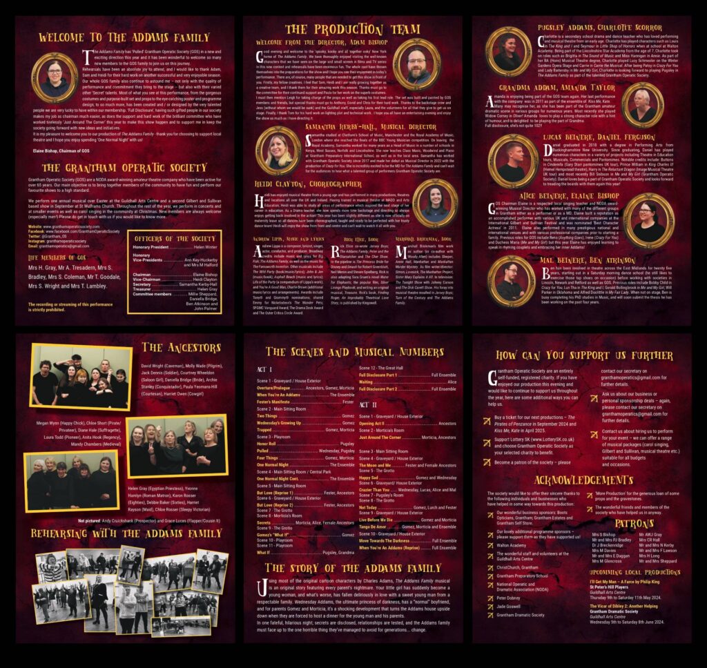 Our programme for our 2024 production of ‘The Addams Family’ WON the award for best mid-range programme design in the whole of the East Midlands area (with a special mention to our programme designer Ben for all his hard work).